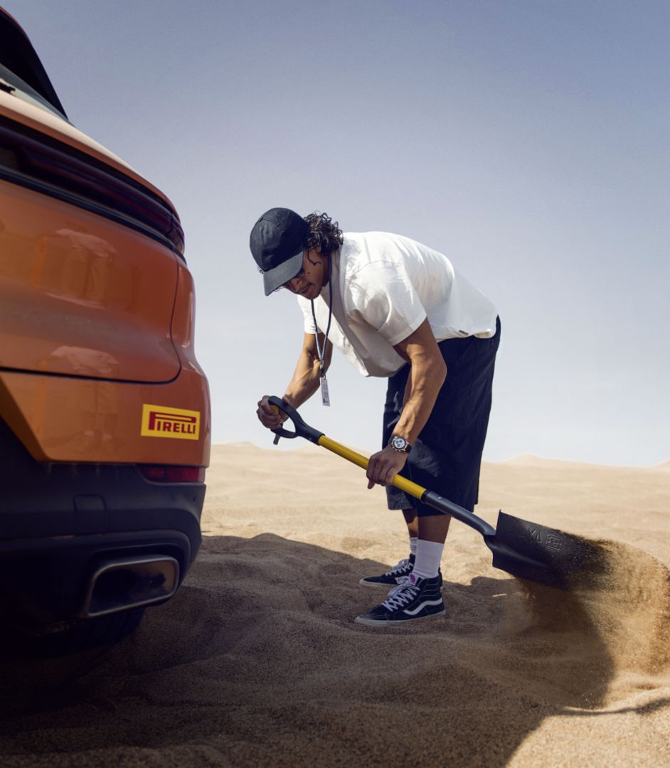 ... musste sich Emilio Sakraya in seinem Leben immer wieder – aus dem Wüstensand allerdings noch nie. Das Erlernen von Bergungstechniken stand am ersten Tag der Porsche Desert Experience auf dem Programm.Am ersten Tag hat der Macan seinen großen Auftritt. Mit ihm geht es auf Dünen, die so steil emporragen, dass eine Fahrt in der Achterbahn dagegen wie ein Kinderspiel scheint. Emilio ist in seinem Leben noch nie offroad gefahren. Das hält ihn aber nicht davon ab, ohne zu zögern und voller Vertrauen Gas zu geben. Der Elektrosound mischt sich mit dem Knirschen des Sandes, jetzt kommt es aufs Momentum an und darauf, den Schwung mitzunehmen. Die starke Beschleunigung des vollelektrischen SUV ist genau das, was hier nötig ist, um sicher voranzukommen. Oben auf der Düne ist es so steil, dass man zu kippen glaubt. Doch der Macan ist schneller als die Angst.