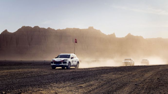 Eine neue Challenge wartet auch in der Wüste auf Emilio: Die Strecke öffnet sich zu weiten Kiesebenen, durchsetzt mit weichem Sand und zerklüfteten Felsen. Jede Oberfläche erfordert andere Fähigkeiten von Fahrer und Fahrzeug, ständige Anpassung ist geboten. Es wird anspruchsvoll, körperlich und intensiv. In dieser rauen Umgebung bewährt sich der Cayenne mit seiner Robustheit und Präzision. Er pflügt souverän durch das Geröll – und unter den breiten Reifen bebt die Wüste.