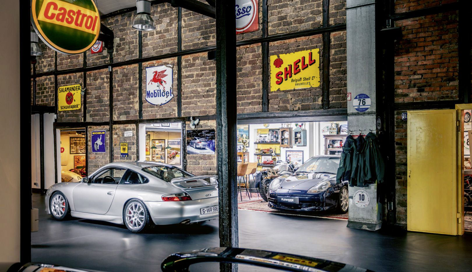 Gemeinsam haben Porsche-Enthusiasten im schwäbischen Flacht – der Heimat des Porsche Motorsportzentrums – in einer alten Remise das „FL8WERK“ (sprich: „Flachtwerk“) eingerichtet. Hinter den Backsteinwänden ist ein privater Rückzugsort entstanden, in dem sich alles um Porsche-GT- und -RS-Modelle dreht. Drumherum Sofas, Flipperautomat, Billardtisch, alte Leuchtreklamen und jede Menge Memorabilia.
