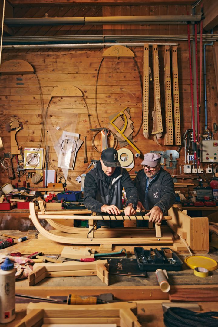 Der Schlitten wurde bei den Morerods designt und wird bis heute, so weit als möglich, auch komplett in der eigenen Schreinerei gebaut. Im dafür hergerichteten Hinterzimmer der Schreinerei riecht es nicht nur wohlig nach Holz und Sägemehl: Alles ist perfekt auf den Schlittenbau ausgerichtet – inklusive der passenden Schablonen und Halterungen für die Werkbank.