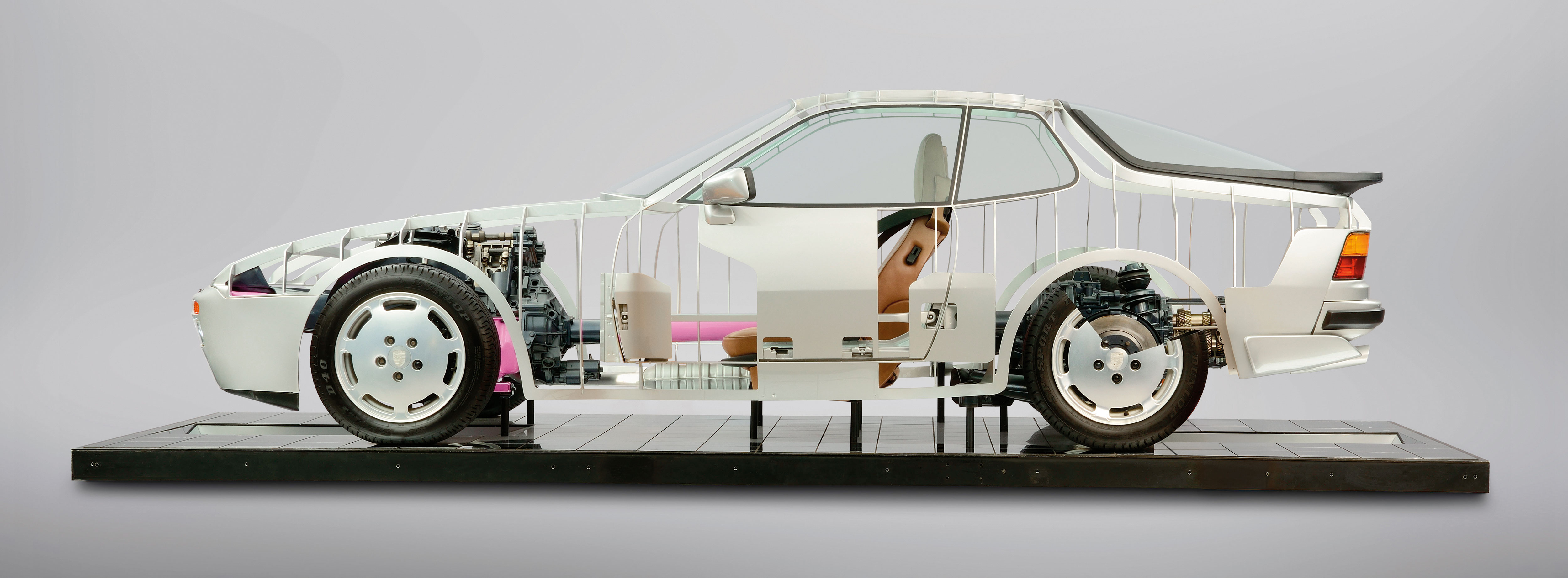 トランスアクスル部品をピンク色に塗ったポルシェ944のカットモデルは、1980年代に説明と教育の目的で作られたものだ。バランスの取れたアクスル荷重配分 (50:50が理想的とされる)は、特にスポーツカーにとって大きな利点がある。フロントアクスルを介したステアリングとリアアクスルを介した駆動力の両方が、正確かつ効率的に路面に伝達できるのだから。バランスの取れた重量配分のおかげで、オーバーステアやアンダーステアなど発生しない。しかも、クルマのバランスがこんな風に整えられていれば、レーサーでなくとも、はるかに簡単、安全に、自信を持ってクルマを運転することができる。