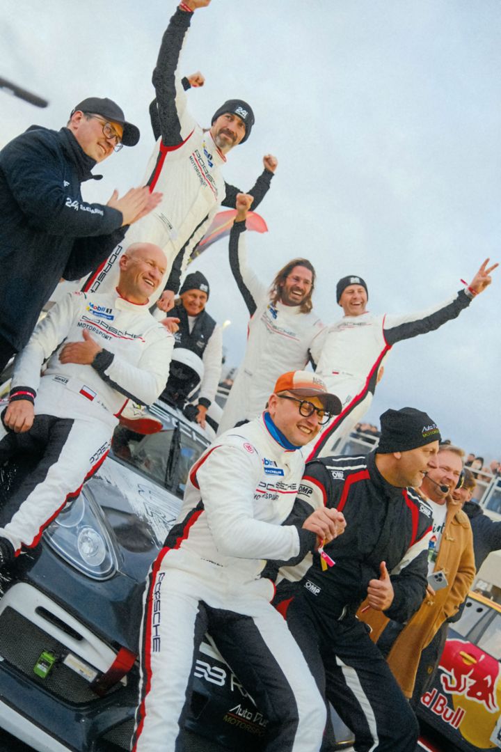 Zespołowa radość ze zwycięstwa w historycznym wydarzeniu.Każdy błąd mógł kosztować nie tylko wynik, ale i sens całej, trwającej dobę pracy. Udało się. Kilka minut po godzinie 16 samochód zespołu 88 Racing Team przekroczył linię mety. 88 Racing Team zwyciężył w najbardziej wymagającej kategorii „jednosamochodowej”. Takiej, która najbardziej przypomina legendarny wyścig 24h Le Mans i wymaga od samochodu oraz zespołu nieprzerwanej pracy przez całą dobę. W innej klasie i klasyfikacji generalnej też triumfowało Porsche – kilka 911 GT3 RS zespołu Rennsport, które zmieniały się w ramach sztafety.