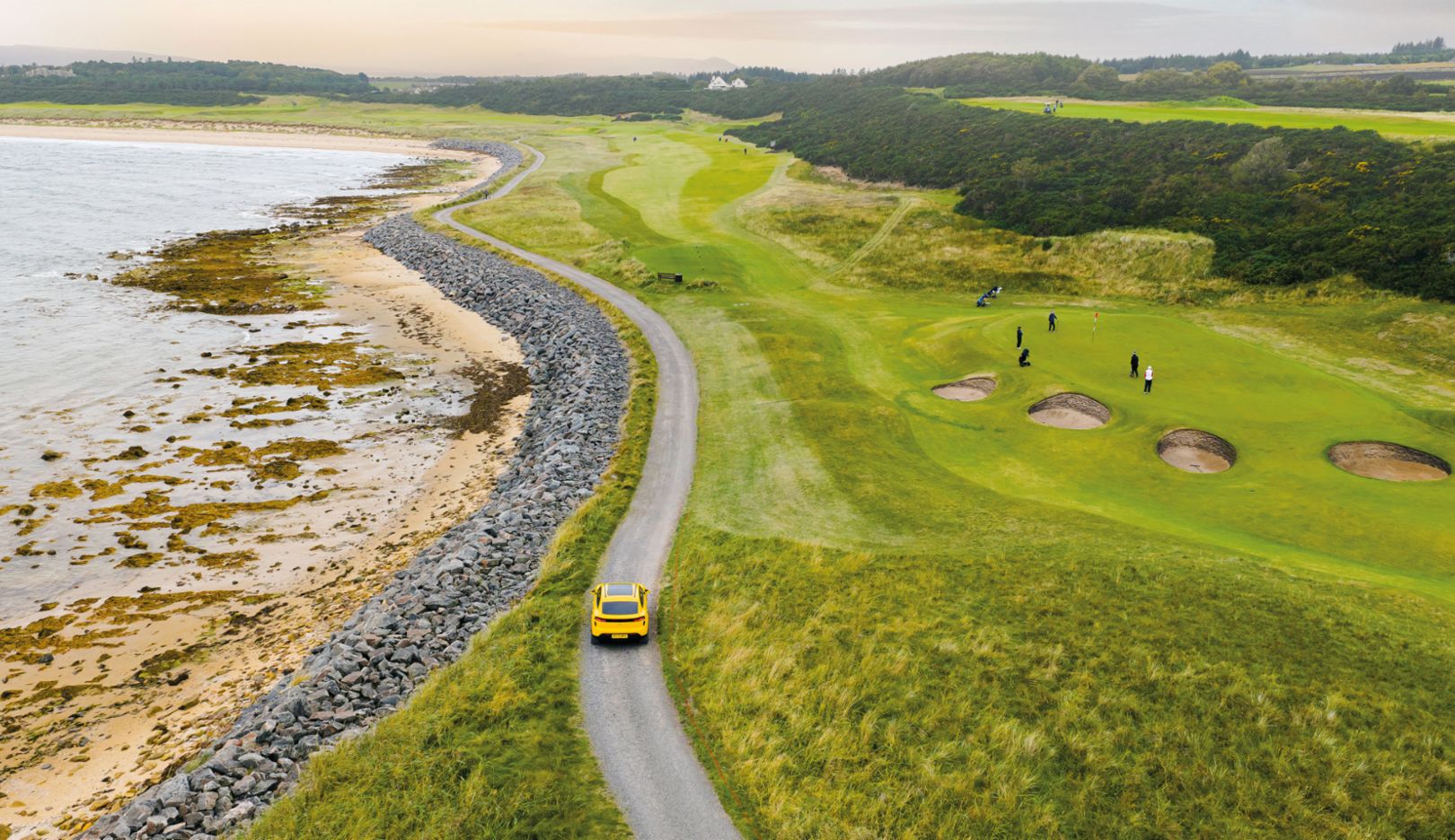 Hotel Glenmorangie House na północno-wschodnim wybrzeżu słynie ze swojej wyszukanej kuchni – ze świeżych, finezyjnie przyrządzanych lokalnych składników z regionu (powyżej). Zaledwie kilka minut od trasy North Coast 500 znajduje się Royal Dornoch, trzecie najstarsze pole golfowe na świecie i klasyczne pole typu links (poniżej). Ten specjalny typ pola golfowego cechują przede wszystkim twarde fairwaye, głębokie bunkry piaskowe i porywiste wiatry.Następnego ranka wyruszamy o świcie, chociaż kolejny przystanek na trasie jest niedaleko. Zaledwie pół godziny drogi na północ znajduje się Royal Dornoch Golf Club. Pierwsza partia na tym legendarnym terenie została rozegrana w 1616 roku. Już w 1964 r. amerykański ekspert ds. golfa Herbert Warren Wind określił to miejsce „najbardziej naturalnym polem na świecie” i dodał, że żaden golfista nie będzie w pełni wyszkolony, zanim nie zagra i nie nauczy się gry na Royal Dornoch. Aby tutaj grać, nie trzeba być członkiem klubu, jednak wskazana jest rezerwacja. Podczas gdy pierwsi sportowcy przybywali tu prawdopodobnie konno, my przyjeżdżamy dziś Macanem Turbo o mocy 470 kW (Macan Turbo: zużycie prądu, cykl łączony (WLTP) 20.7 – 18.4 kWh/100 km, emisja CO₂ średnia (WLTP) 0 g/km, CO₂ class A ), czyli około 639 koni mechanicznych.