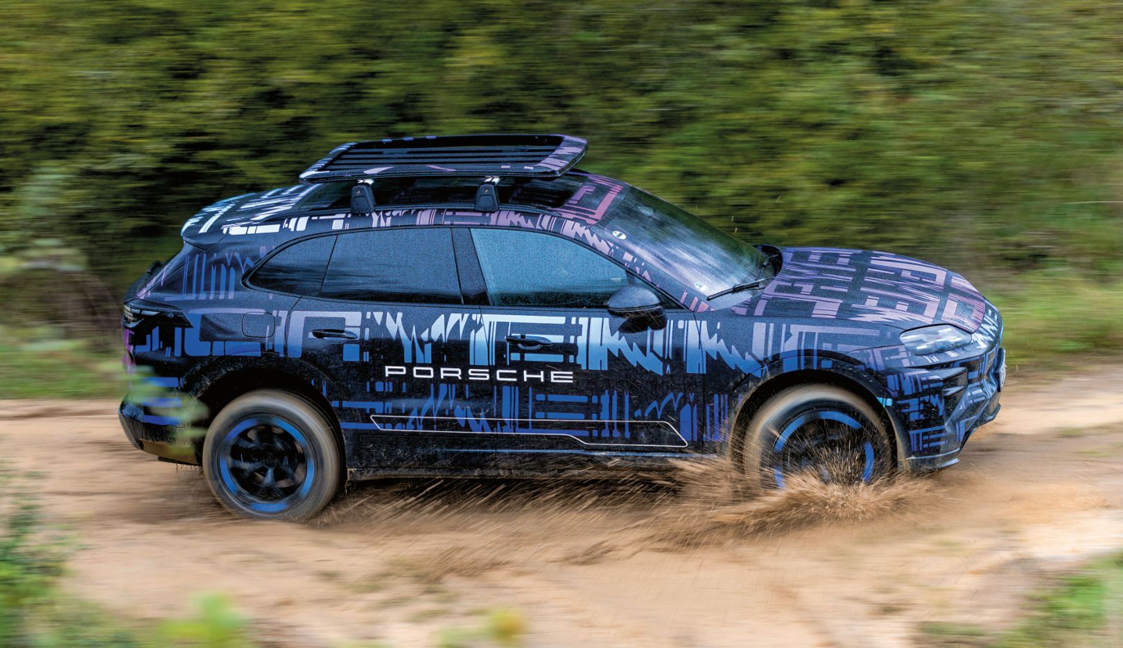 披覆 Cayenne Electric 原型車迷彩的電動方程式賽車 99X Electric 進行測試中。這是技術轉移的象徵——例如兩款車型皆實現高達 600 千瓦的動能回收效能。在賽道上完成數圈高速行駛後,我們前往體驗中心的越野跑道。這輛運動車款旋即轉變為越野悍將。陡峭的爬坡、交叉軸地形、惡劣的顛簸路面,Cayenne Electric 都能從容應對。然而,此時正是各種控制系統大顯身手之時。「每個車輪僅被分配其能在濕滑路面上傳遞的扭力。」舍茨勒解釋道。保時捷循跡管理系統 (PTM) 能在 5 毫秒內完成全可變扭力分配。