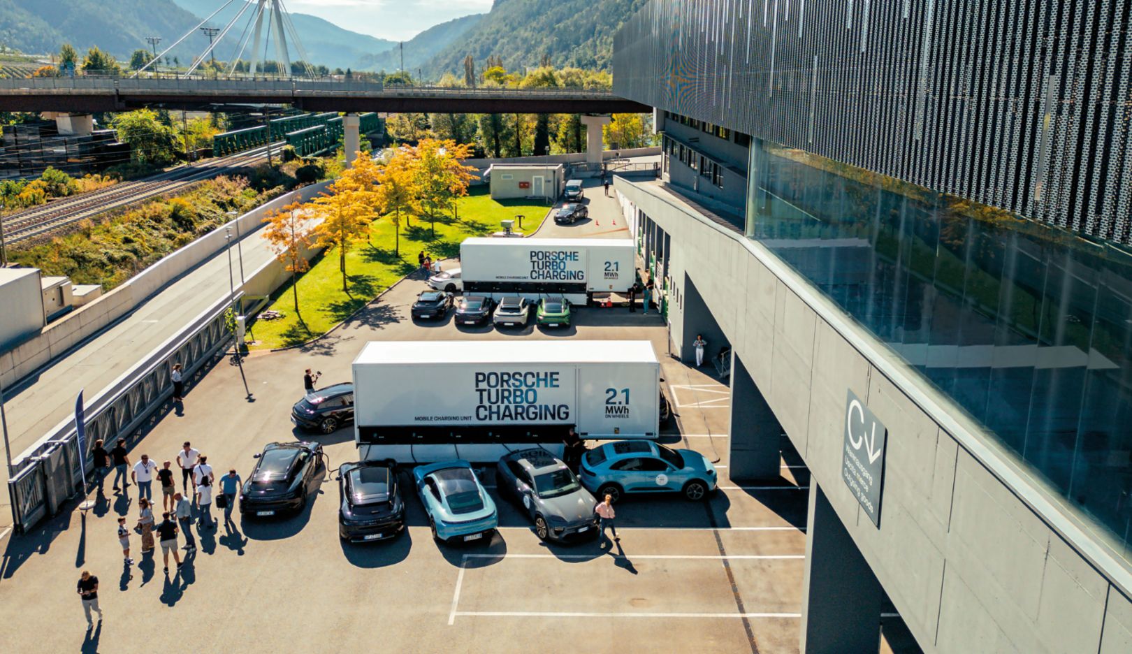 抵達布里克森,車隊享用午餐並充電。當成員們享用大麥湯與南提羅爾傳統冷盤時,這群電駒正於工業倉庫旁補充電量。考量到 73 輛車同時使用公共電網充電幾乎難以達成,兩座保時捷高速充電 (Porsche Turbo Charging) 移動設備早已嚴陣以待。這些只有在歐洲賽道才看得見的重裝卡車,今日專為獨一無二的保時捷俱樂部服務。每組設備以重達 14 噸、儲能 2.1 MWh 的鋰電池,驅動十座 280 kW 高速充電樁。充電助理們則穿梭協調,確保每輛車都能以滿電再出發。